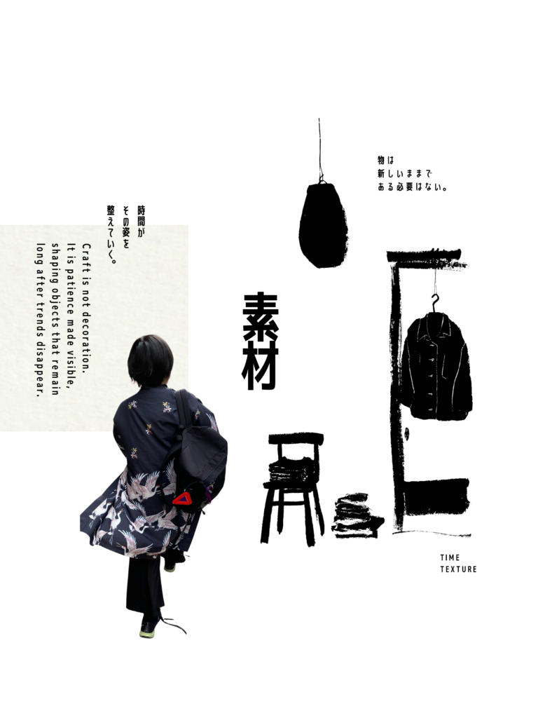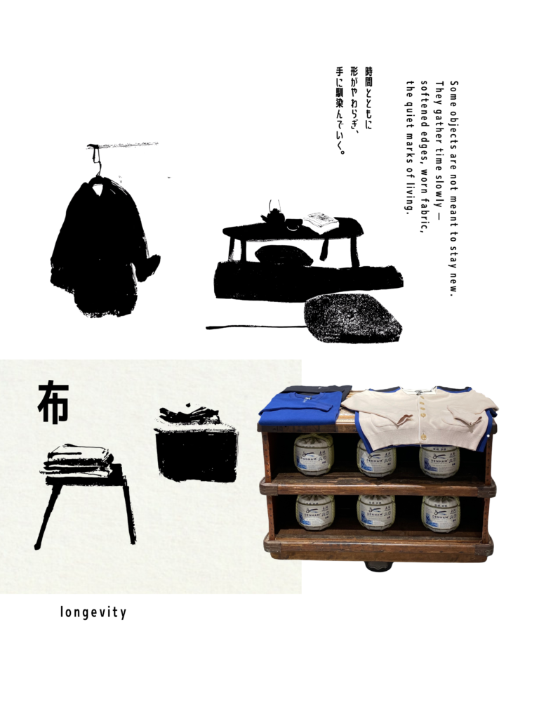 In Japan there is a long appreciation for objects that change gently with time. Materials such as wood, cloth, and ceramic are valued not only for how they look when new, but for how they slowly evolve through use. Edges soften, surfaces deepen in color, fabric begins to carry the memory of movement. These changes are not flaws. They are signs of a life lived alongside the object.